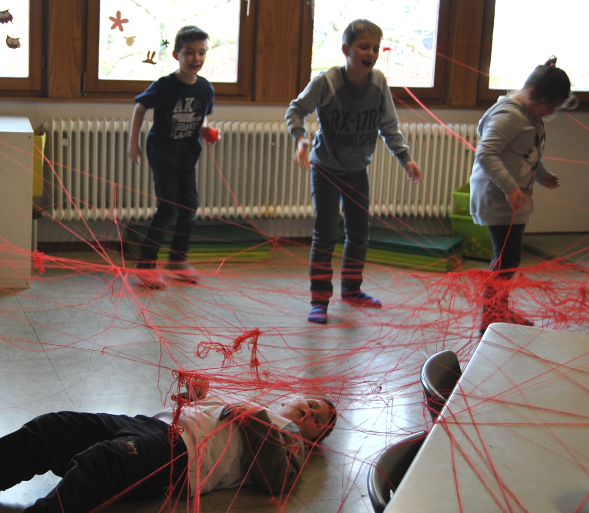 Anregungsvolle Räume laden ein zum Rollen- und Theater spielen, Bauen und Konstruieren, Malen und kreatives Gestalten, sowie zum Bewegen und Entspannen. Das freie Spiel nimmt daher in unserem Alltag bewusst einen großen Raum ein. Uns stehen zwei Gruppenräume, eine Küche und ein großer Flur im Obergeschoss des ev. Gemeindehauses (Mittelstr.24), 300 Meter von der Schule entfernt zur Verfügung. Die Toiletten im Erdgeschoss sowie ein Teil des Außengeländes mit einem großen Hof und einer Wiese mit einem schattenspendenden Baum, worauf wir eine Picknicktischgruppe mit einer Kiste Außenspielzeug stehen haben, nutzen wir ebenso.